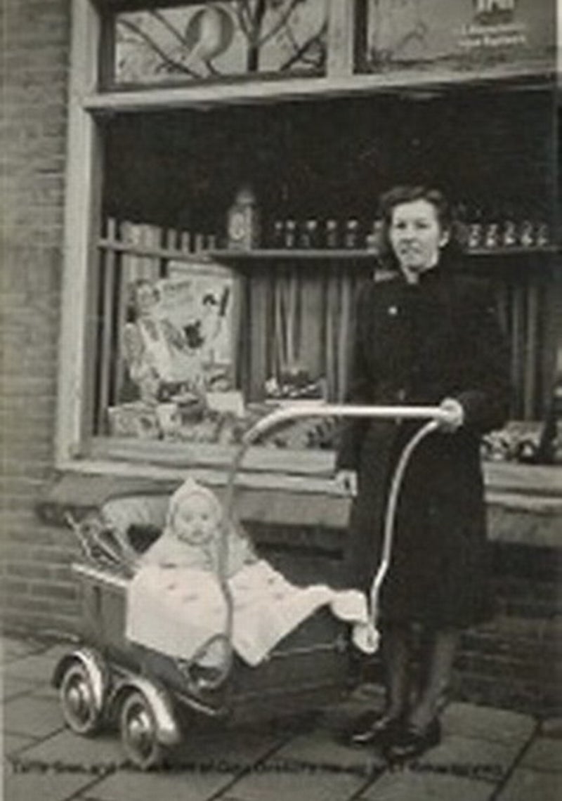 oor het huis op nummer 61, Margje Broekstra-Dekker met Jim Broekstra in de wandelwagen.