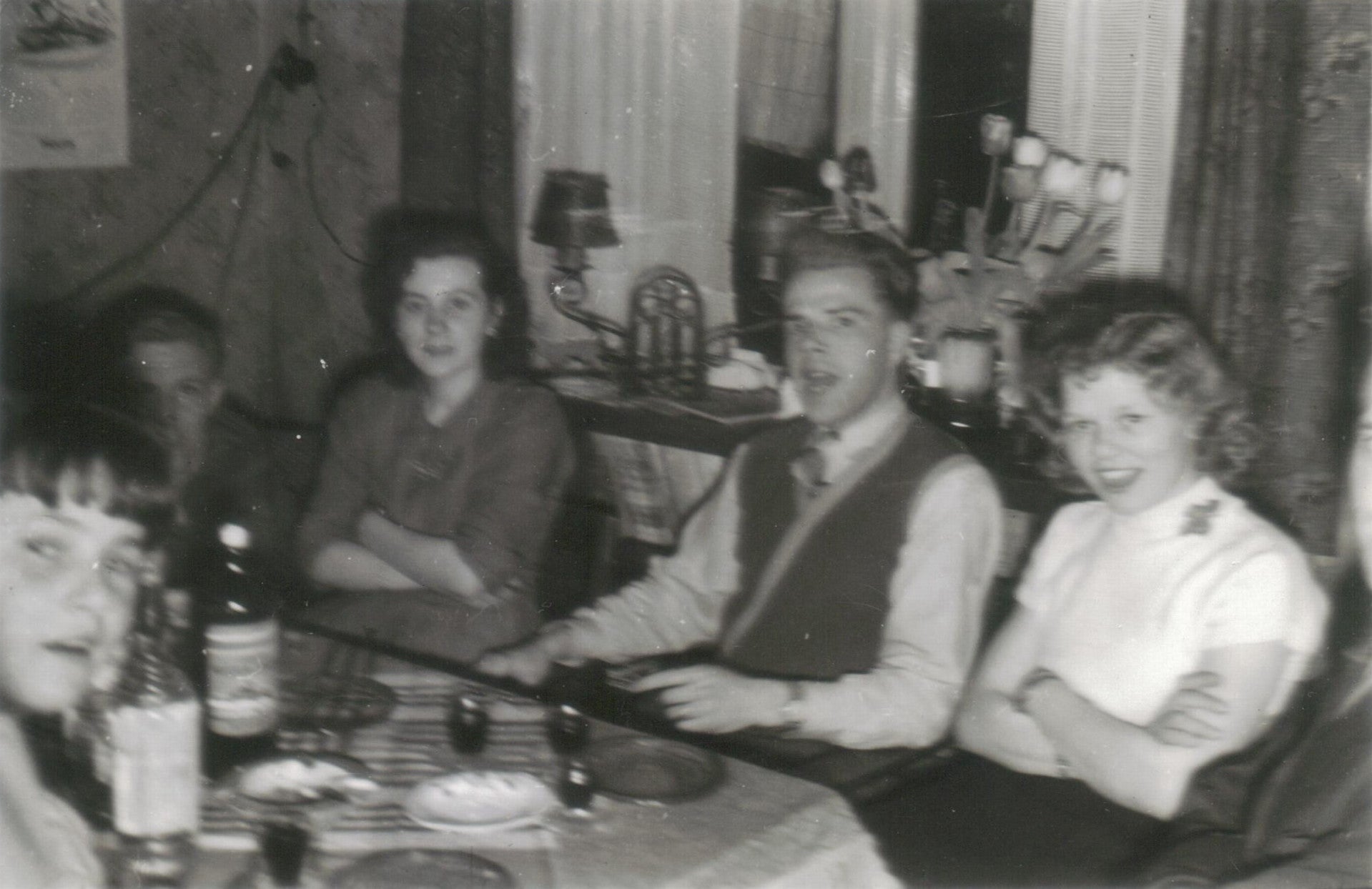 Zittend van links naar rechts: de heer Hermans, Gerrit Dekker, tante Sien, Nel van Hedel, Mevrouw Hermans,